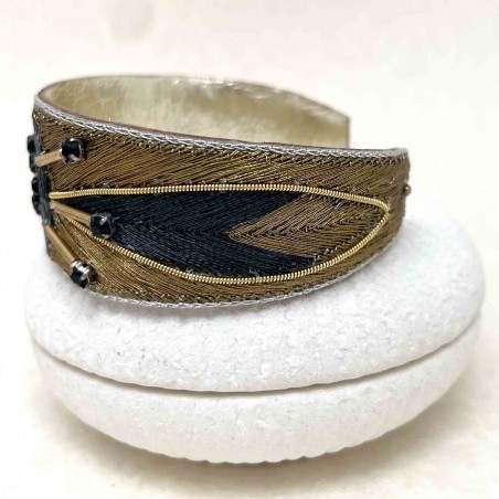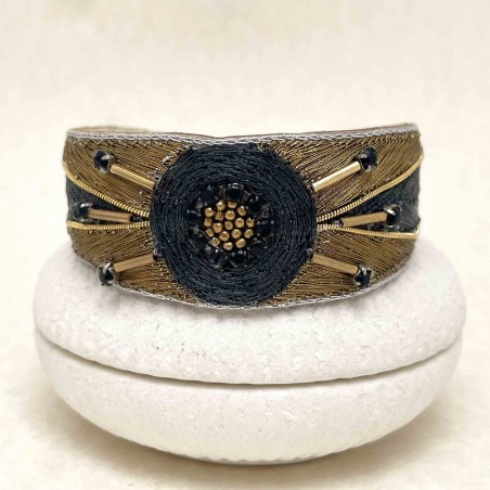 Bracelet hand-embroidered with metallic thread, strass and brass beads , soft leather lining, adjustable by pressure.