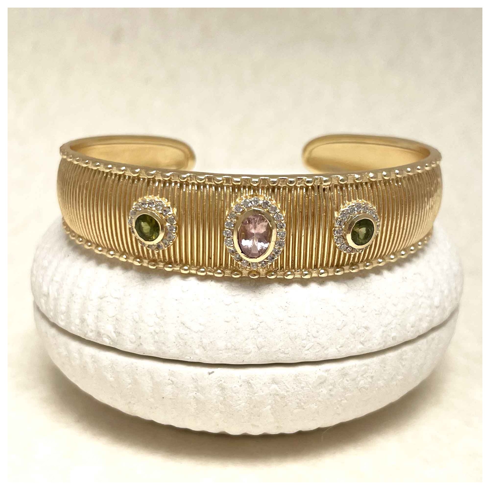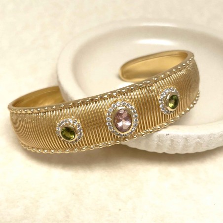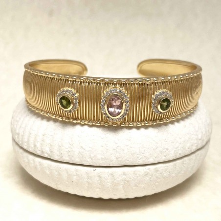 Yellow gold-plated brass bracelet set with tourmaline and zirconiums. Adjustable size