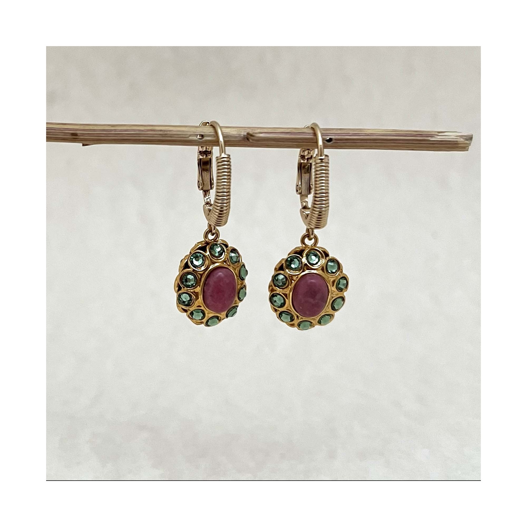 Gold-plated brass earrings featuring a medallion adorned with colored gemstones.