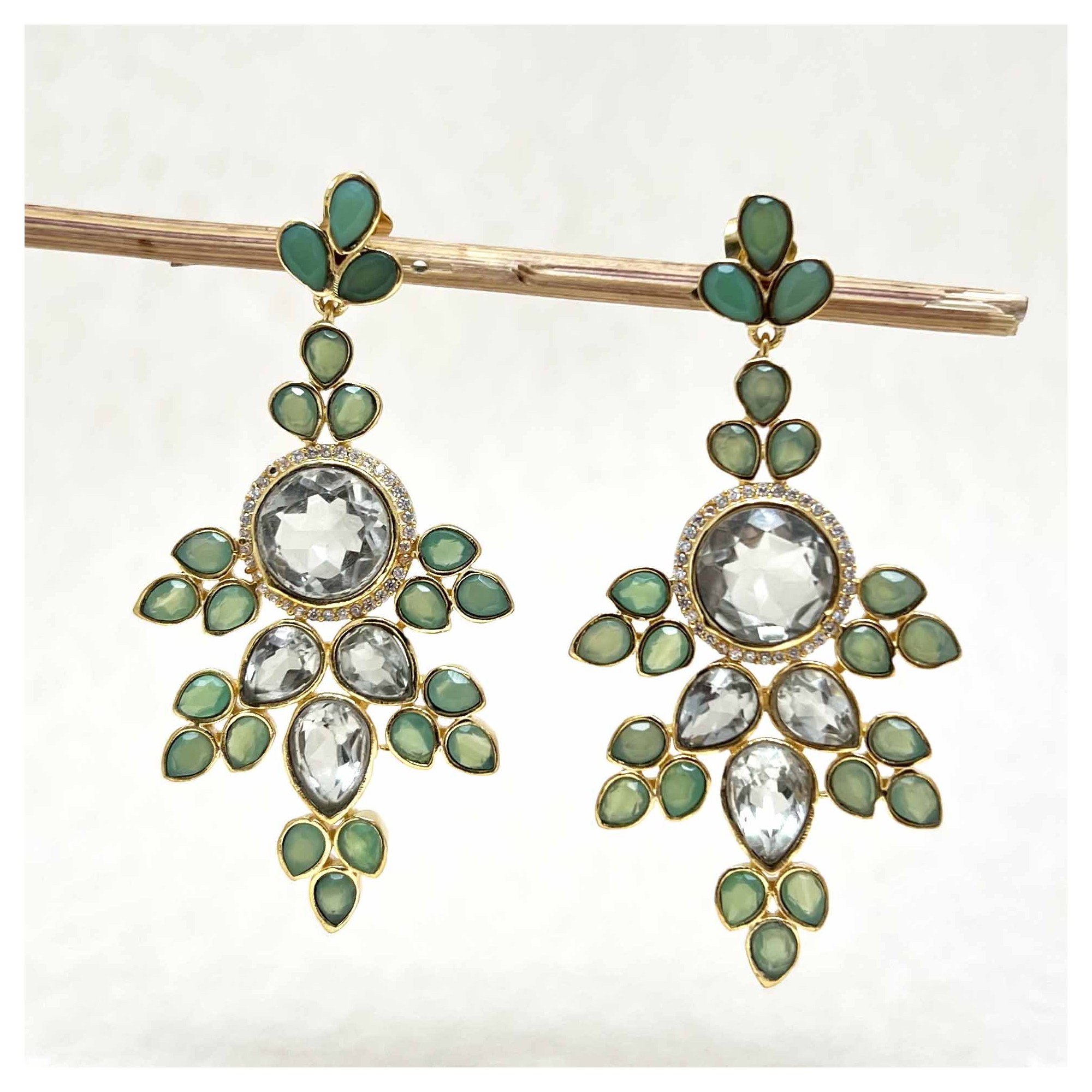 Yellow gold-plated brass earrings set with green amethyst and chrysoprase