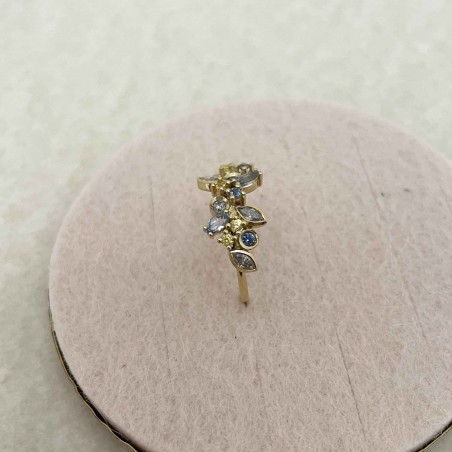 18k recycled yellow gold Camélia Sophie d' Agon ring set with 15 precious stones : 5 light blue sapphires, 6 salt & pepper diamonds, and 4 light yellow sapphires