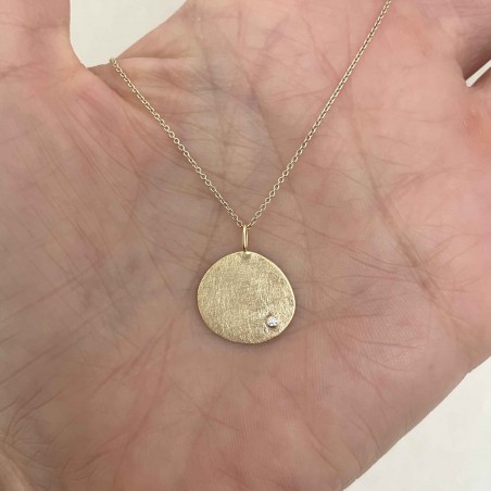 14k yellow gold medal necklace with a brushed finished and a diamond.