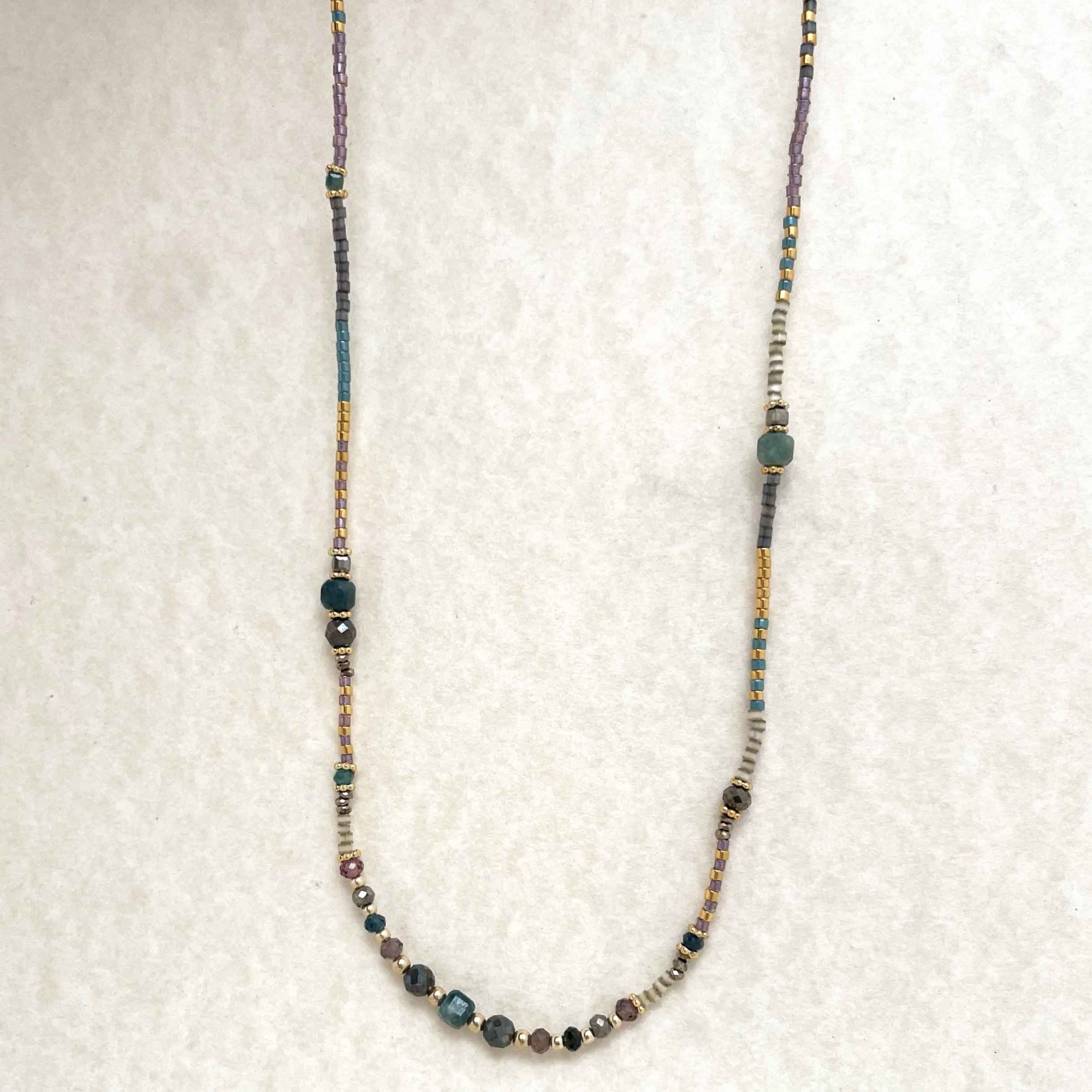 Necklace crafted with semi-precious stones and Japanese glass beads , finished with a 14k gold-filled clasp.
