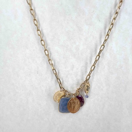 Yellow gold-plated brass necklace set with blue and pin sapphire and medals.