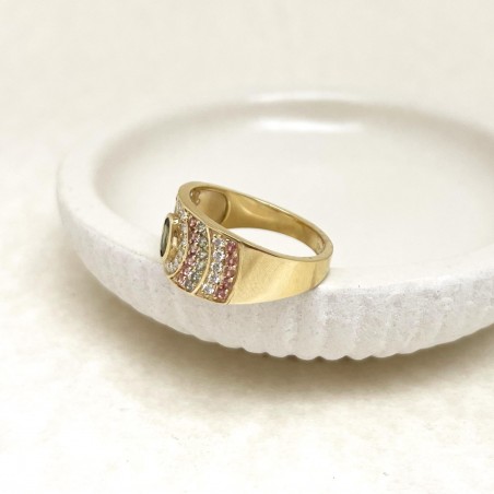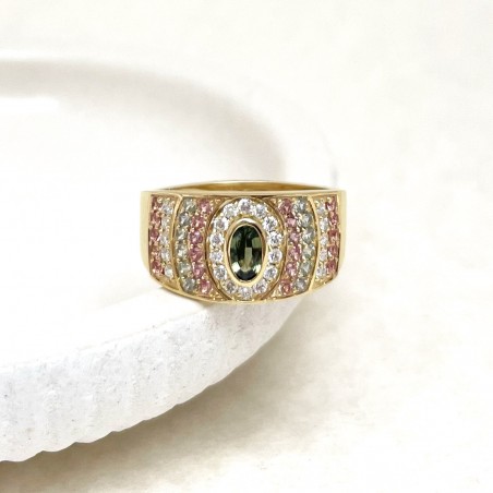 18k yellow gold ring set with a central green sapphire framed by cognac and lime green sapphires highlighted by diamonds