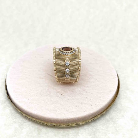 Bague en laiton plaquée à l'or jaune et sertie d'une tourmaline rose au centre et de zirconium.