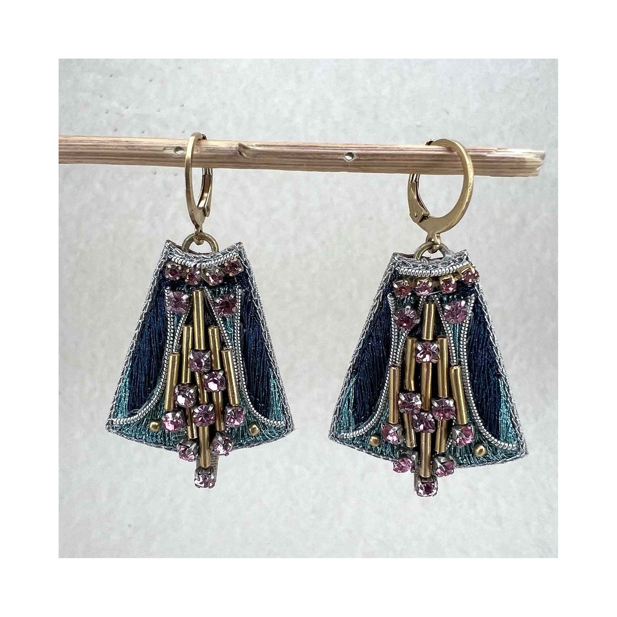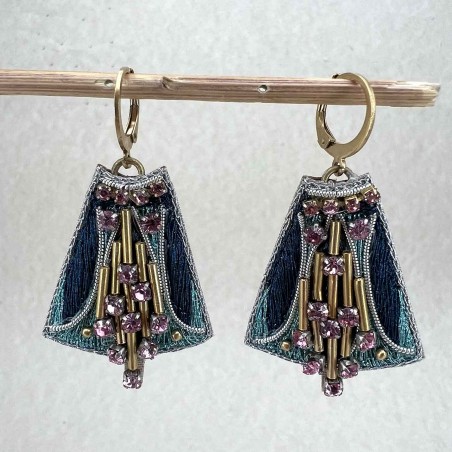 Boucles d'oreilles métalliques brodées à la main de fil métallisé. Perles en laiton et strass, doublure en cuir souple et attaches en laiton inoxydable et anti-allergène.