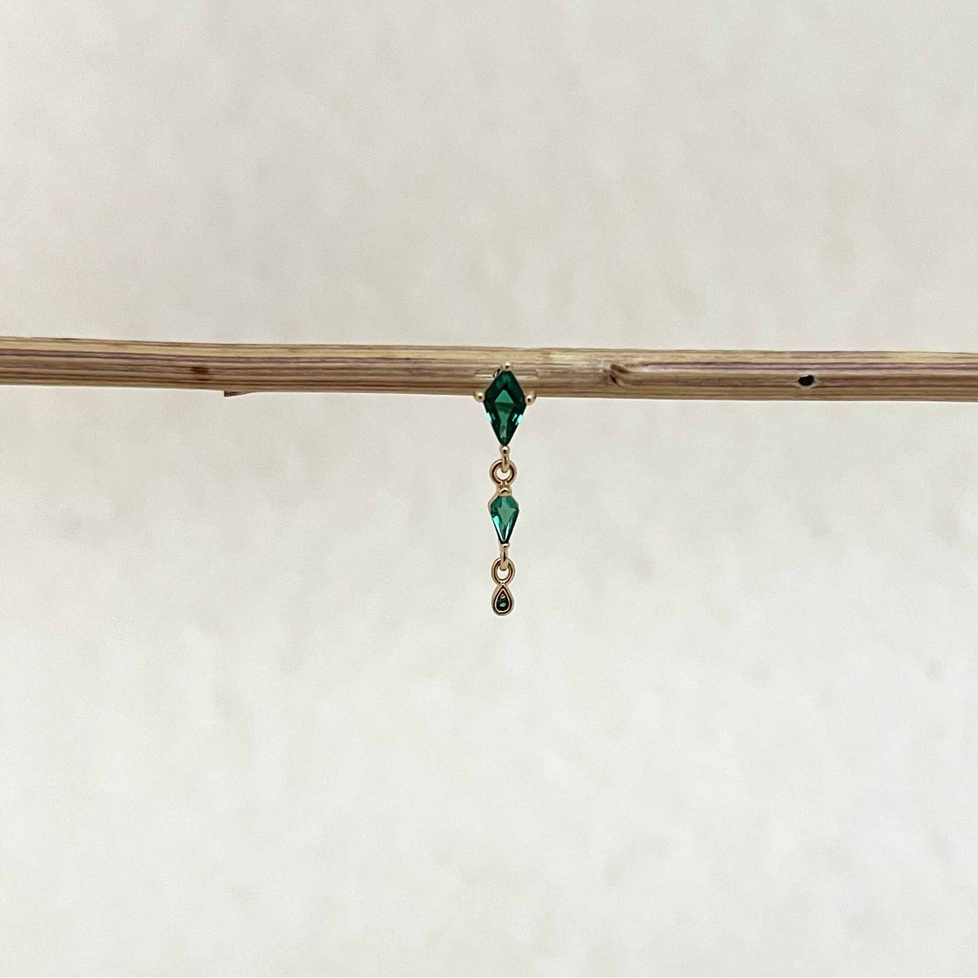 Boucle d'oreille en laiton plaquée à l'or jaune et montée avec des zirconiums verts.