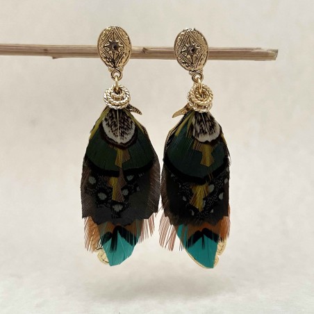 Boucles d'Oreilles en laiton plaquées à l'or jaune, montées avec de sublimes plumes.