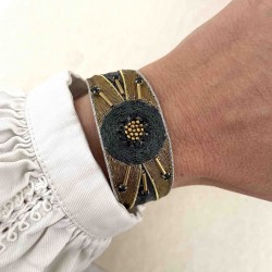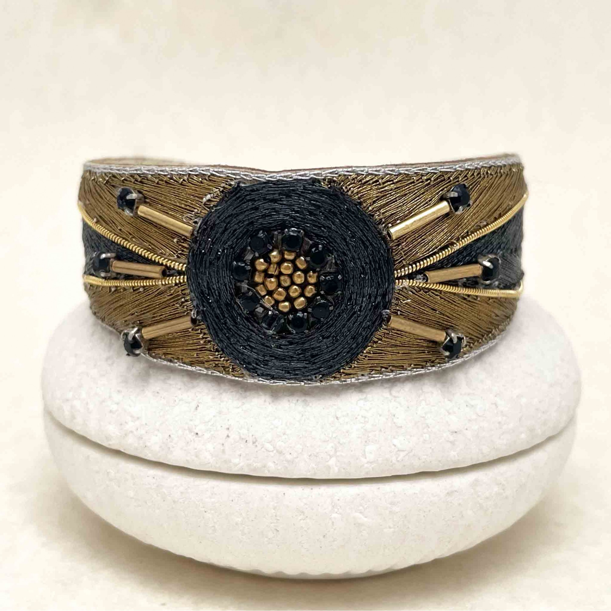 Bracelet brodé à la main de fil de métallisé, strass et perles en laiton, doublure en cuir souple, réglable par pression.