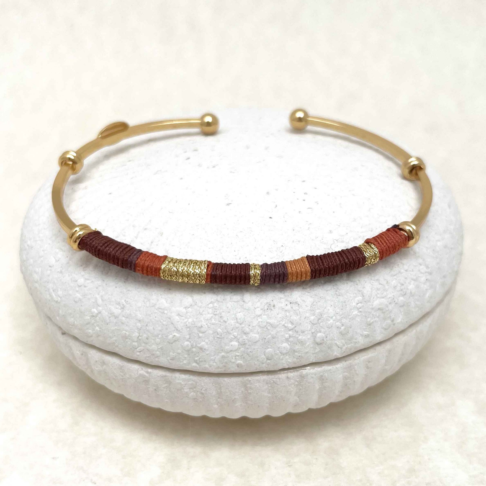 Bracelet en laiton plaqué à l'or jaune partiellement enroulé de fils colorés, ajustable, il s'adapte à tous les poignets.