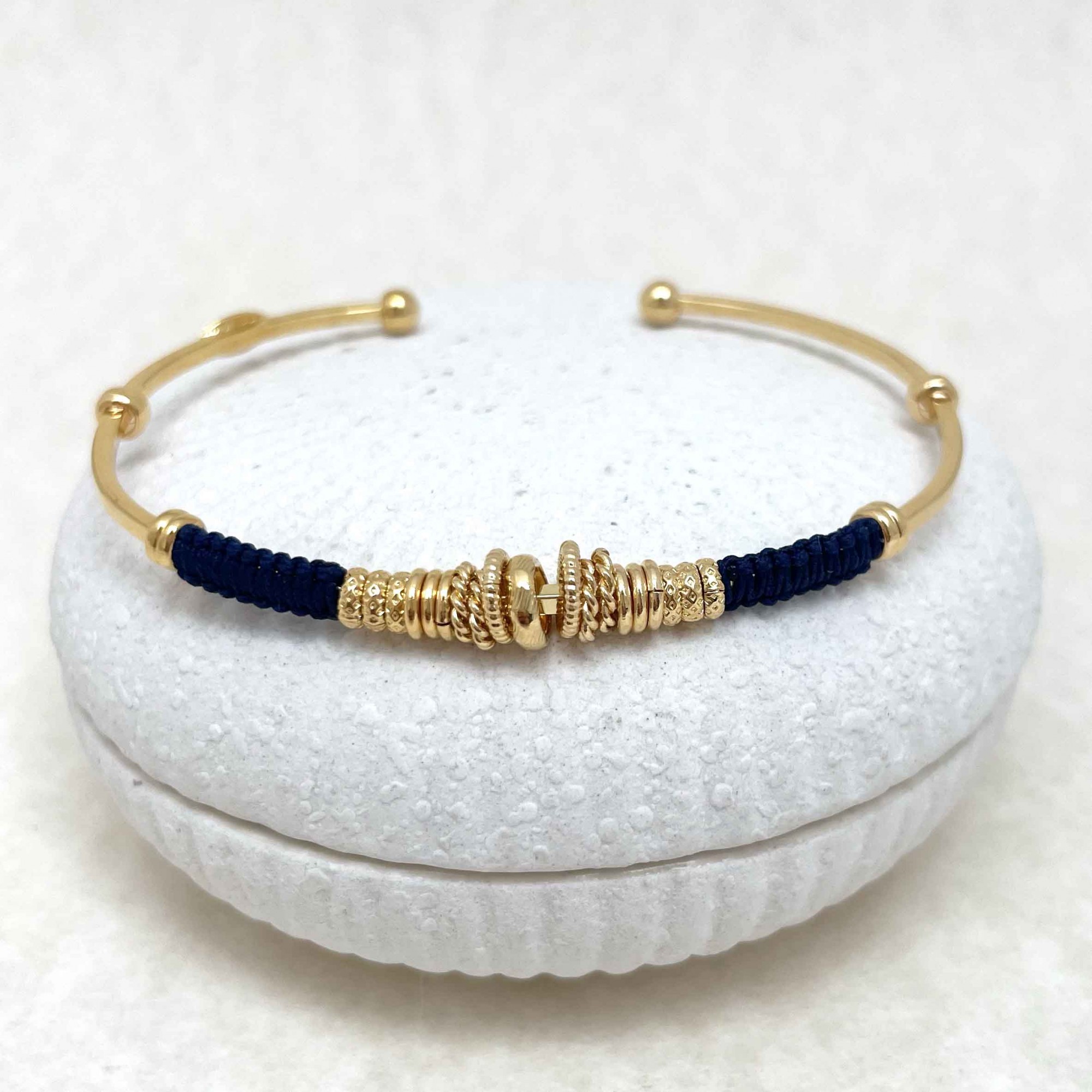Bracelet en laiton plaqué à l'or jaune partiellement entouré de fils colorés et monté avec des anneaux d'inspiration vintage.