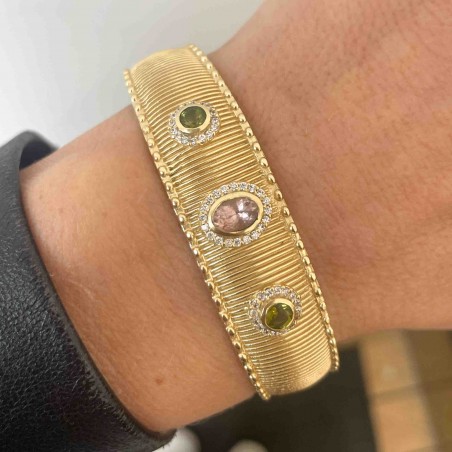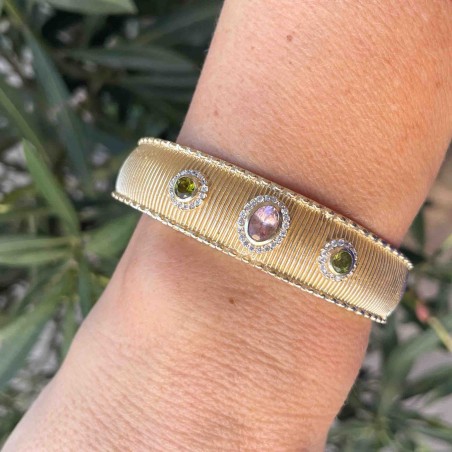 Bracelet en laiton plaqué à l'or jaune et monté avec des tourmaline et des zirconiums.