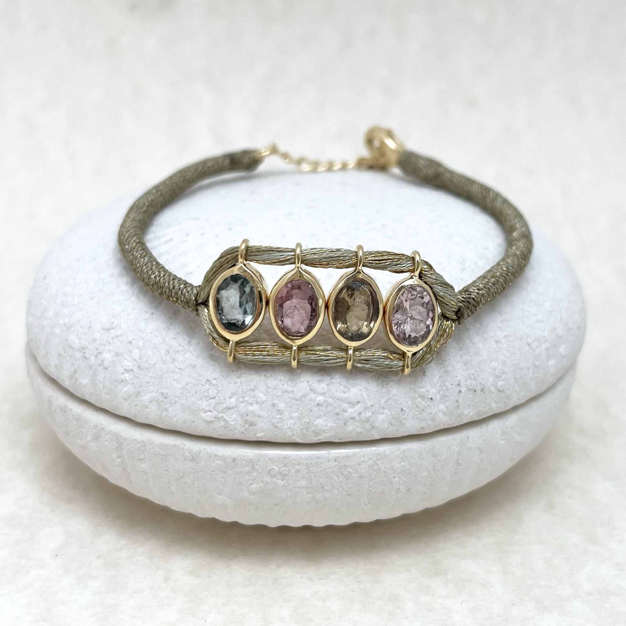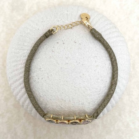 Bracelet en laiton plaqué à l'or jaune et monté avec des tourmalines et sur fil lurex.