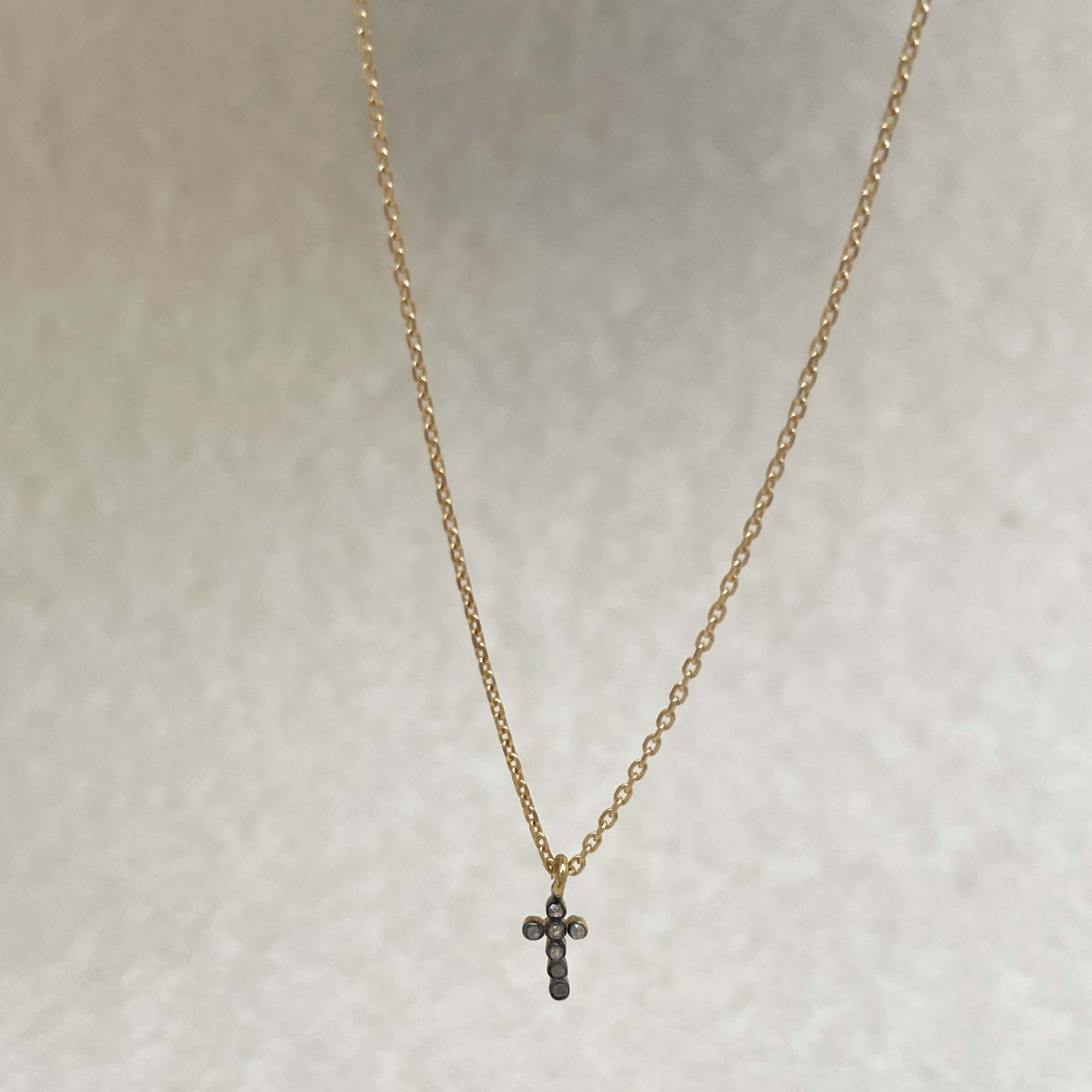 Collier en argent plaqué or jaune , rhodiage noir sur La Croix montée avec des diamants.