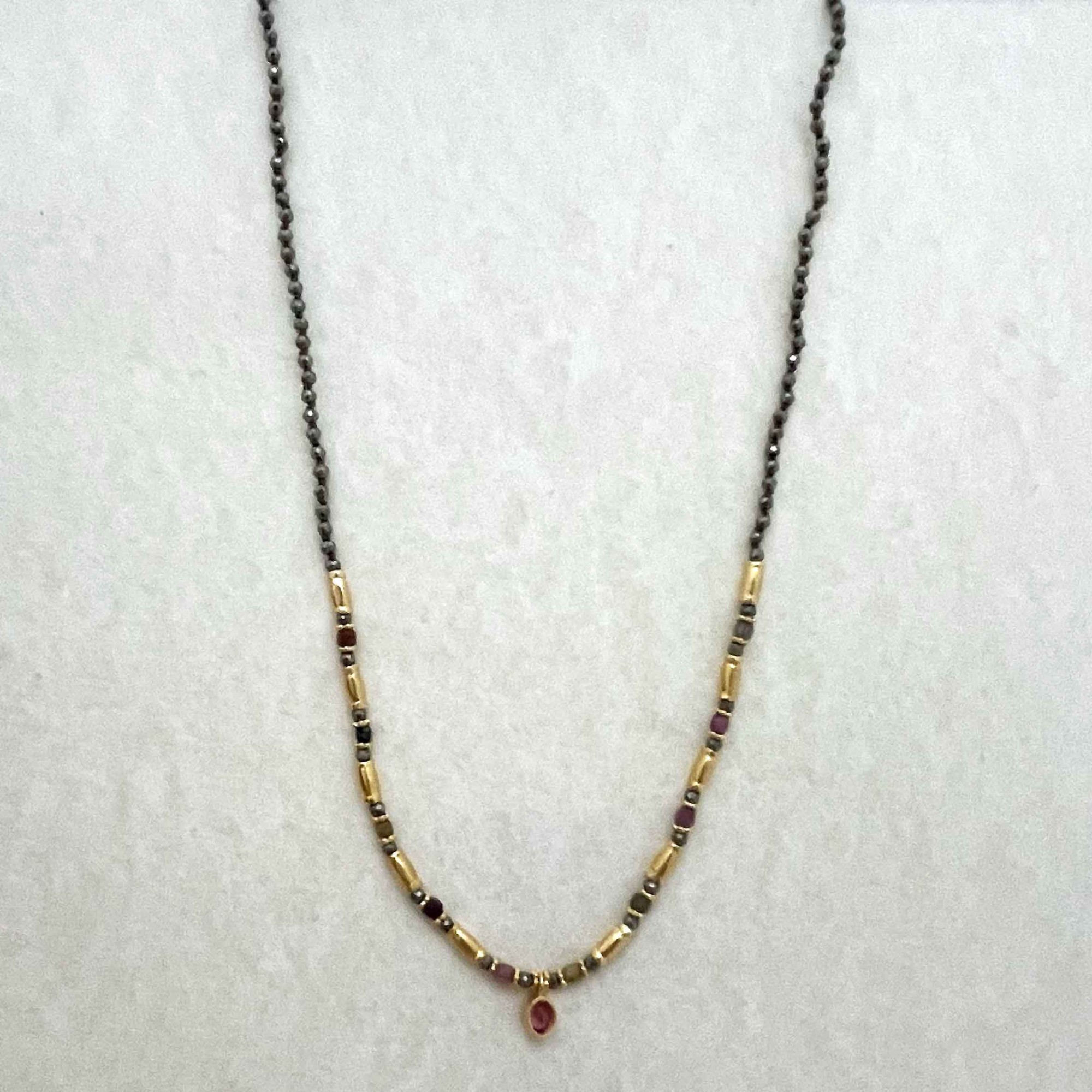 Collier en argent plaqué à l'or jaune et monté avec des pierres semi-précieuses, tourmalines et pyrites